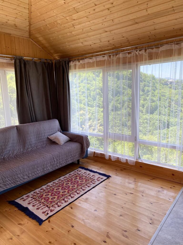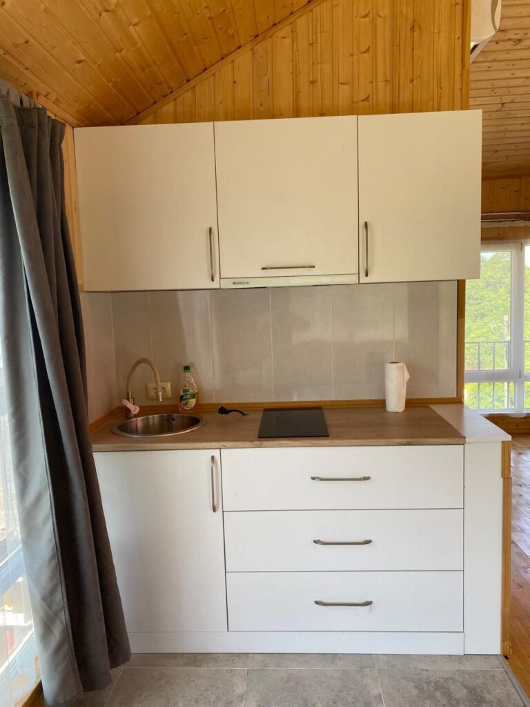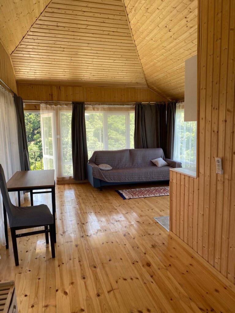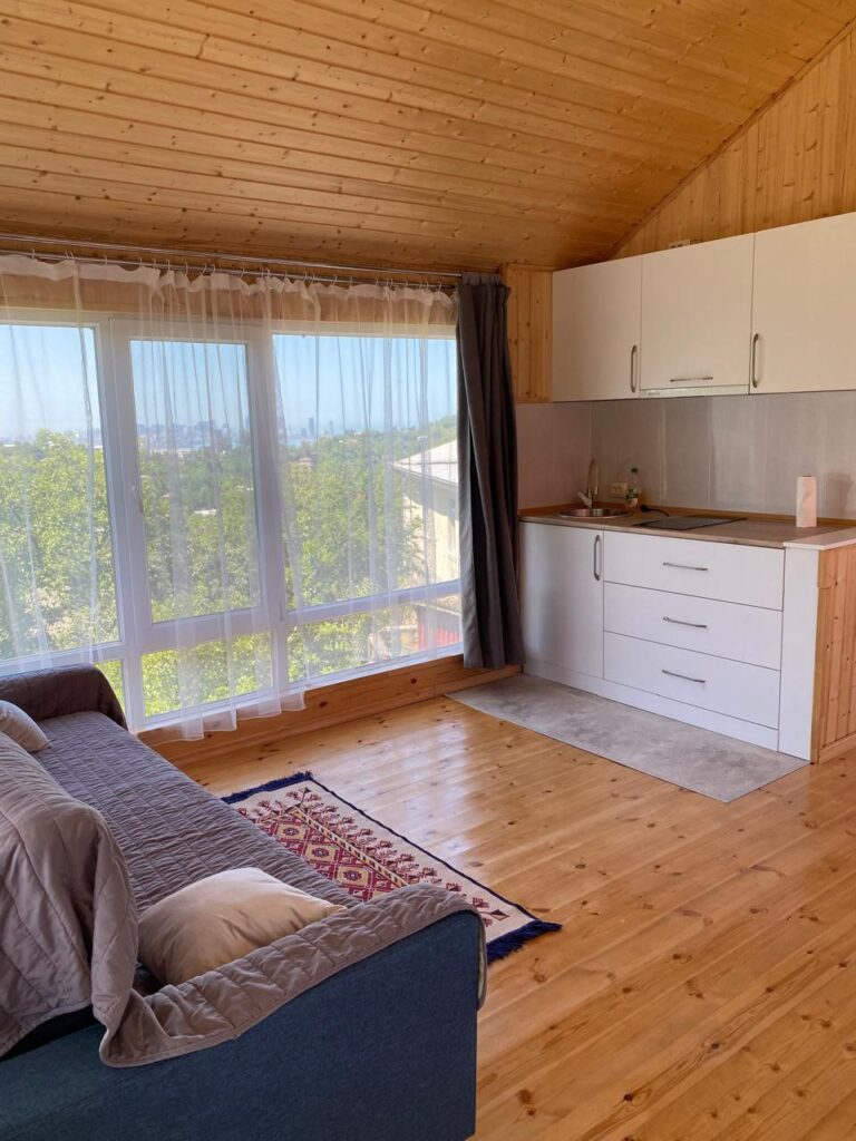 Второй этаж: двуспальный диван; кухня; туалет, душ; кондиционер, Wi-Fi.
