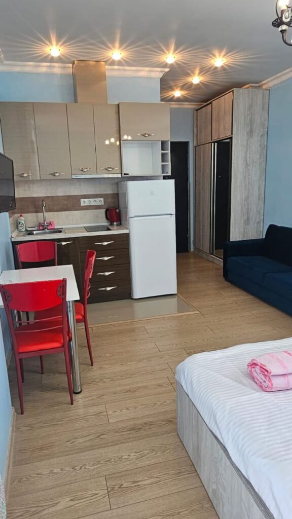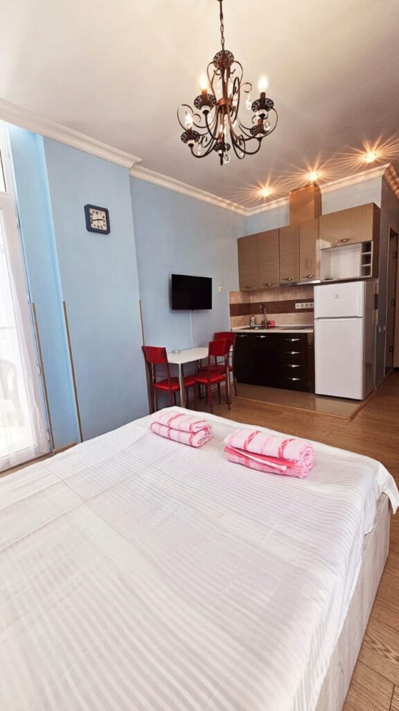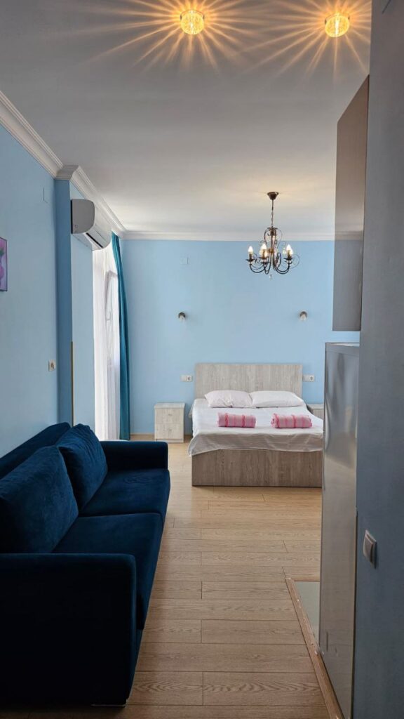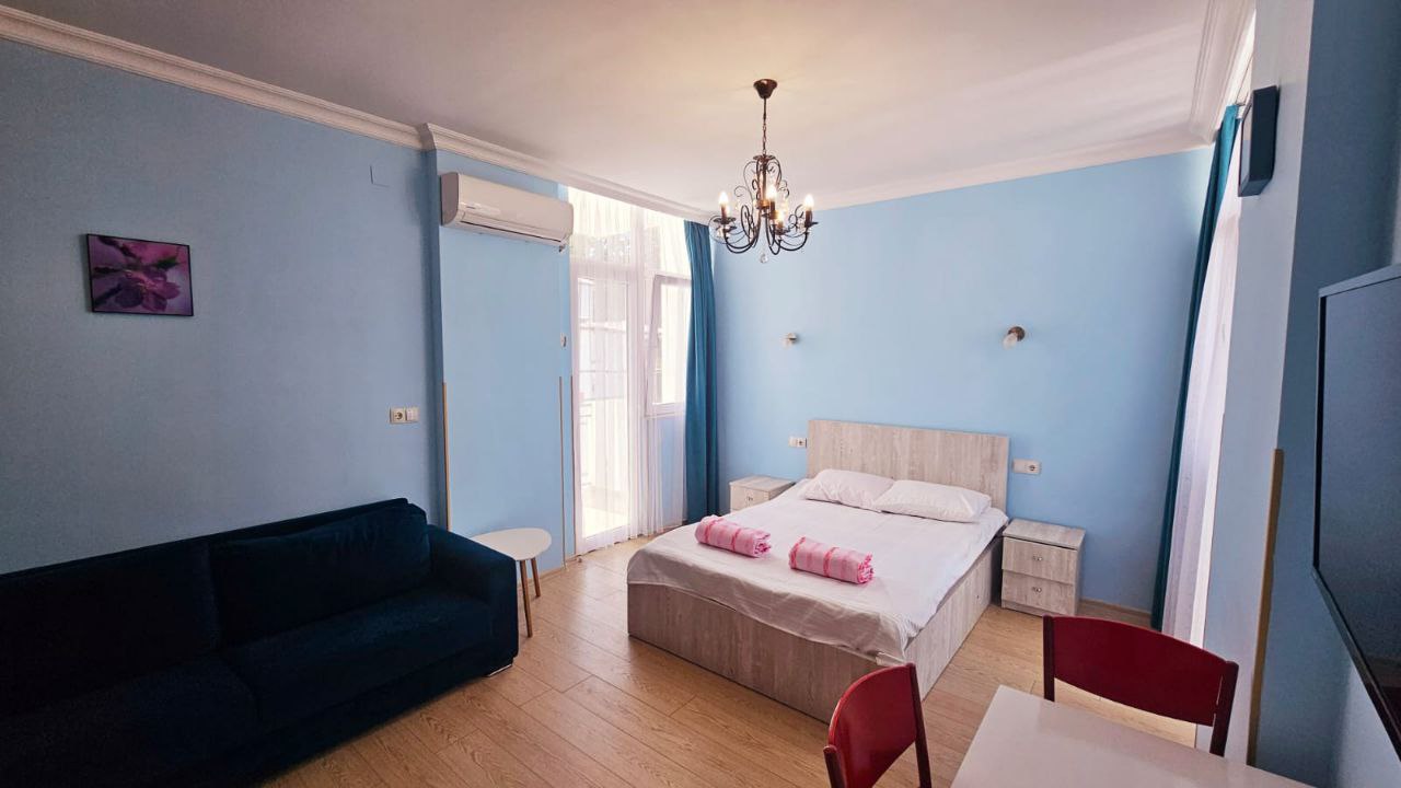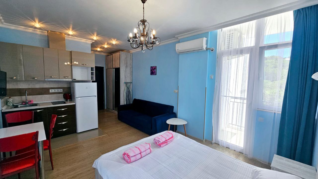 Продаётся светлая студия в 100 метрах от пляжа, с двумя балконами и панорамным видом на море и горы. Студия полностью отремонтирована и оборудована всем необходимым для постоянного проживания или приёма гостей.
